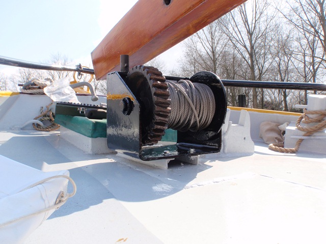 Het is een wormlier. De meest gebruikte lieren zijn met een groot tandwiel op de klos, en een kleiner tandwiel op het rondsel, en dan met een pal voor de vergrendeling bij het hijsen, en een remband voor het strijken. Bij een wormlier zit er in plaats van een klein tandwiel een vast wormwiel op de rondselstang. Het voordeel is. Verder is er geen vergrendelpal nodig, en ook geen remband. Het voordeel is, dat het lekker eenvoudig werkt. Je hoeft alleen maar te kijken dat je de goede kant op draait. Verder kun je in welke srand dan ook gewoon de slinger los laten, om even koffie te drinken. Het nadeel is, dat je zowel moet slingeren voor het zetten, en voor het strijken van de mast.