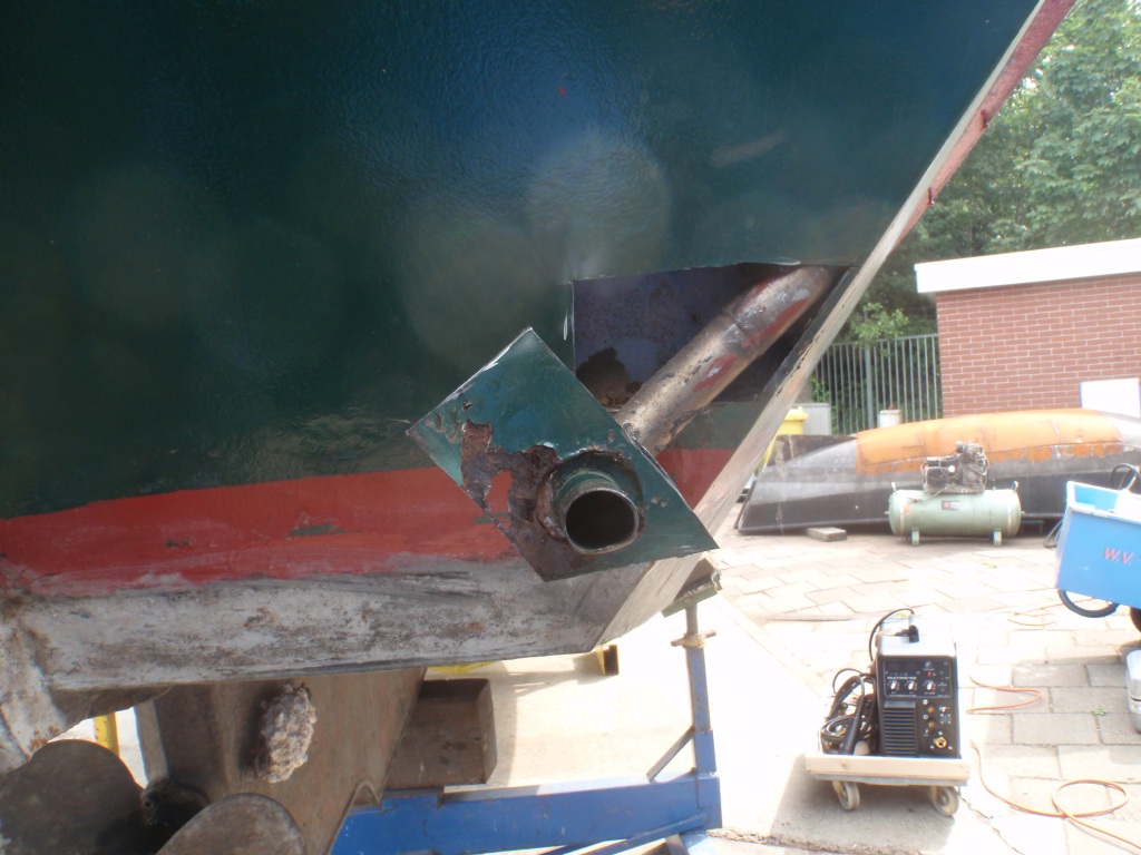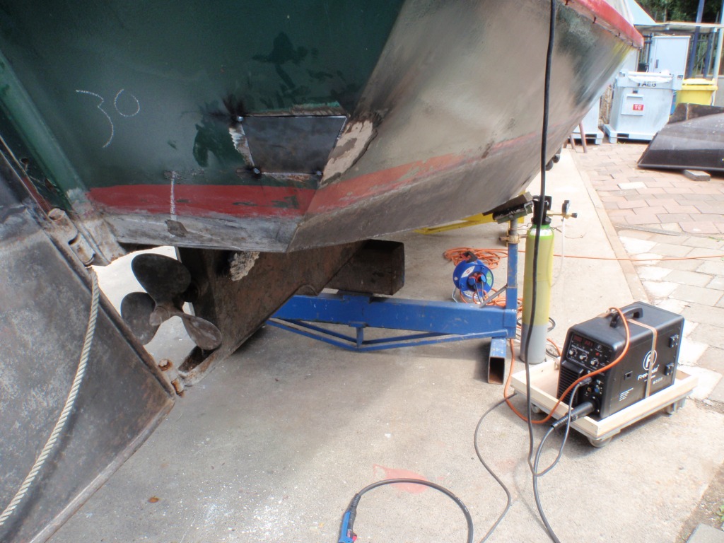 Ondertussen heeft Ferry een gat voor de uitlaat geboord (in het stuk staal dat hij de vorige keer erop heeft gelast) en daarnaast heeft hij zich uitgeleefd met het lasapparaat. In het roer zat bijvoorbeeld een gat op de plek waar waarschijnlijk ooit een vlaggestok houder heeft gezeten. Het leek er op dat die er een keer is afgeslepen en dat het gat toen is opgevuld door plamuur. Heel soms kan het handig spul zijn om een echte krater mee glad te strijken, maar in dit geval was het staal eronder niet goed geconserveerd en toen is het onder het plamuur gaan roesten. Ferry heeft hier een nieuw stuk rond staal aan gelast en het ziet er weer zo goed als nieuw uit.