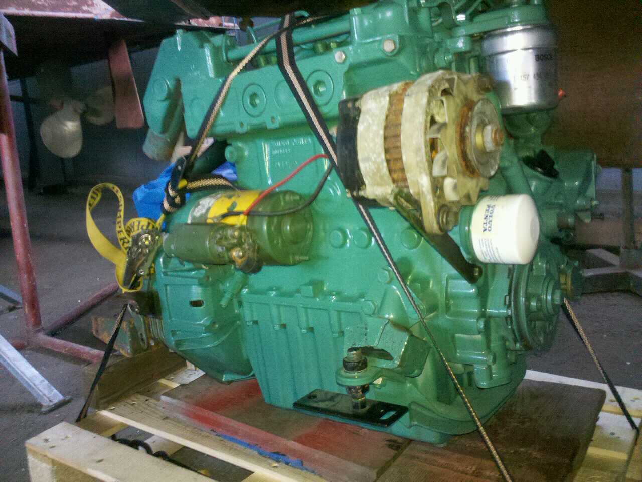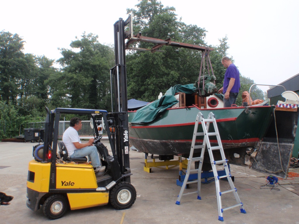 Vandaag geen las, schuur, slijp of lak klussen. Vandaag hebben we de "nieuwe" motor opgehaald. Eerst even een aanhanger geregeld bij een oom van Ellen, 2 motoren passen niet in de kofferbak van een Peugot 207sw. De havenmeester heeft met de heftruck geholpen om de oude motor uit de boot te tillen en in de aanhanger te parkeren. Eerder hebben we de motor al losgemaakt van de schroefas, elektra en morse-kabels los gemaakt en de moeren van de motorsteunen gelost. Er zat nog een stukje boot in de weg om de motor er uit te halen. Met mijn timmermans oog had ik bepaald dat de motor omhoog kon tot boven de bouten, dan een kwartslag draaien om vervolgens er helemaal uit te kunnen. Toen bleek toen dat het carter te groot was, en dat de draai niet paste. Het stukje boot moest er aan geloven, en de slijptol werd gepakt. Echter bleek dat er over nagedacht was met het inbouwen van deze motor, dat stukje boot zat vast met bouten. Dus de slijptol weer opgeruimd, en 2 bahco's gepakt. Motor in de aanhanger en weg wezen.